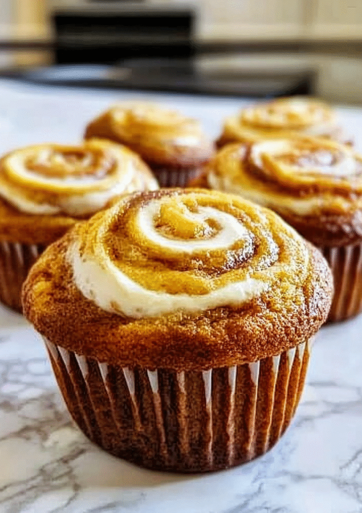 Moist pumpkin spice muffins with a creamy swirl—perfect for cozy mornings, holiday brunch, or a sweet snack.